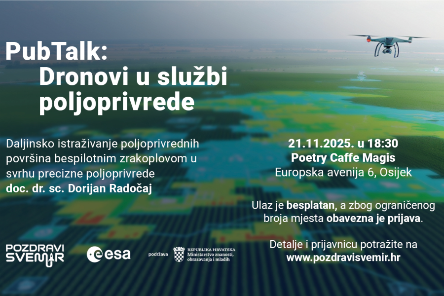 Poseban naglasak će biti na praktičnim koracima snimanja dronom, od pripreme i prijave leta, postavljanja orijentacijskih točaka, planiranja parametara i meteoroloških uvjeta, do same provedbe leta i obrade prikupljenih podataka. Opisat će se i proces izrade oblaka točaka, digitalnog modela visina i ortofota visoke prostorne razlučivosti. Kroz primjere će biti prikazane mogućnosti primjene u poljoprivredi: određivanje topografskih parametara, gustoće sklopa kukuruza, monitoring usjeva pomoću vegetacijskih indeksa (NGRDI, TGI) te detekcija korova.*Projekt “Pozdravi svemir” financira Europska svemirska agencija, a podržava Ministarstvo znanosti, obrazovanja i mladih. Cilj je svemirsku tematiku približiti stručnoj zajednici i široj javnosti, jer svemirske tehnologije već danas oblikuju našu svakodnevicu. Posebno se projektom želi potaknuti mlade u Hrvatskoj da prepoznaju prilike u svemirskoj industriji, koja otvara prostor inovatorima, istraživačima, inženjerima i stručnjacima raznih profila.