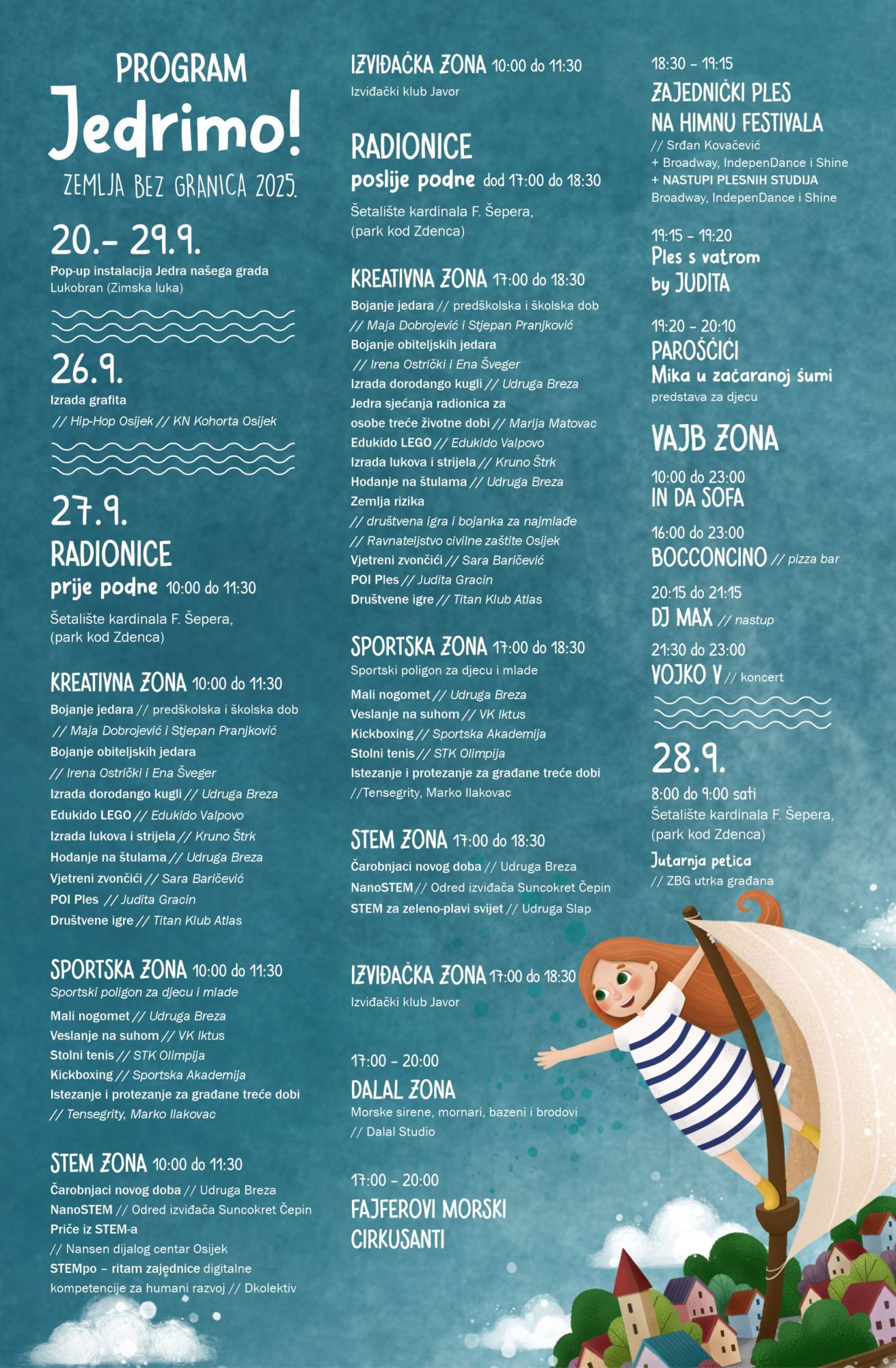 Zemlja bez granica 2025 – Jedrimo! najveći obiteljski festival u regiji ove se godine održava od 26. do 28. rujna u Osijeku. Program nosi manifestacijski naziv Jedrimo! i poziva sve generacije da zaplove Panonskim morem ljubavi, znanja, strpljenja i nade.